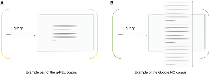 Figure 1. We sample stimuli from (A) the g-REL corpus, which includes pairs of questions and short English news articles, and (B) from the Google NQ corpus, which includes pairs of questions and English Wikipedia articles.