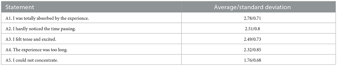 The third section of the questionnaire included statements relevant to game experience aspects which are of interested to our study objectives. This section has been based on questionnaires previously used to evaluate the affective engagement and transformative learning aspects of interactive storytelling experiences (Katifori et al., 2020; Petousi et al., 2022a), on a comprehensive review of user experience evaluation methodologies for art performances and their engagement, absorption, personal resonance and intellectual stimulation aspects (Carnwath and Brown, 2014), as well as the interactive digital storytelling framework by Roth and Koenitz (2016).
