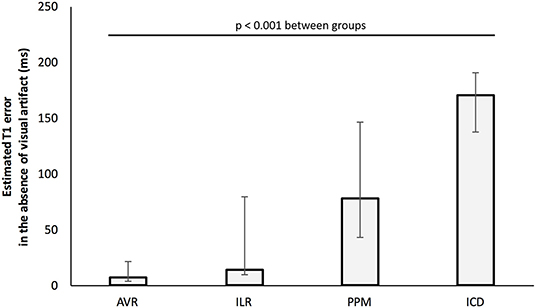 Results: T1 values in healthy volunteers with an ICD were underestimated compared to without (967 ± 52 vs. 997 ± 26 ms respectively, p = 0.0001), but were similar after correction (p = 0.57, residual difference 2 ± 27 ms). Artifact was visible in 4 ± 12, 42 ± 31, and 53 ± 27% of AHA segments in patients with ILRs, PPMs, and ICDs, respectively. In segments without artifact, T1 was underestimated by 63 ms (interquartile range: 7–143) per patient. The greatest error for patients with ILRs, PPMs and ICDs were 79, 146, and 191 ms, respectively. The presence of an AVR did not generate T1 error.