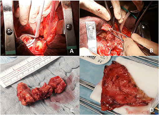 Figure 3. Intraoperative view of residual mass freezing (A and Supplementary Video 1) and removal of superior cava vein mass (B and Supplementary Video 2). In (C), gross surgical pathology of the removed mass (7 cm length) is shown, while in (D), infiltrated pericardium is shown after pericardiectomy.