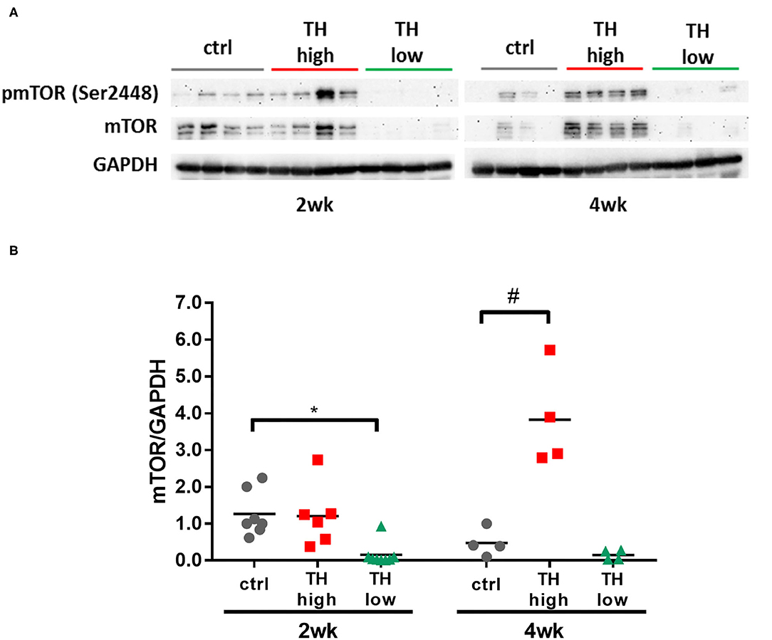 Figure 6. Cardiac expression of mTOR increased with T4 administration and decreased with TH deprivation. mTOR expression was significantly elevated after 4 weeks of T4 treatment, whereas TH deprivation resulted in drastic reduction of mTOR expression within 2 weeks (A,B, n = 4–8). Scatter dot plot and mean, *p < 0.05, #p < 0.0001 by two-way ANOVA and Tukey's post-hoc analysis; ctrl, control; wk, weeks.
