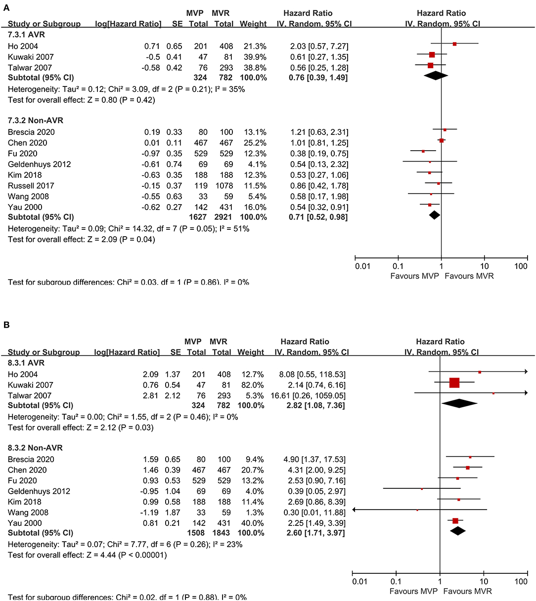 Figure 2. Forest plots showing the results of subgroup analysis according to whether concomitant AVR was performed. (A) Long-term survival and (B) freedom from reoperation. MVP, mitral valve repair; MVR, mitral valve replacement; AVR, aortic valve replacement; IV, Inverse-Variance; CI, confidence interval; SE, standard error.