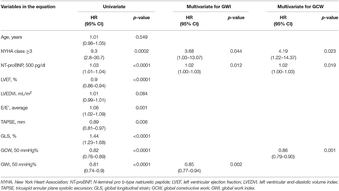 According to the univariate regression analysis, NYHA class, plasma levels of NT-proBNP, LVEF, left ventricular diastolic function (E/e' average), TAPSE, GLS, GWI, and GCW were predictors of the combined outcome (Table 3).