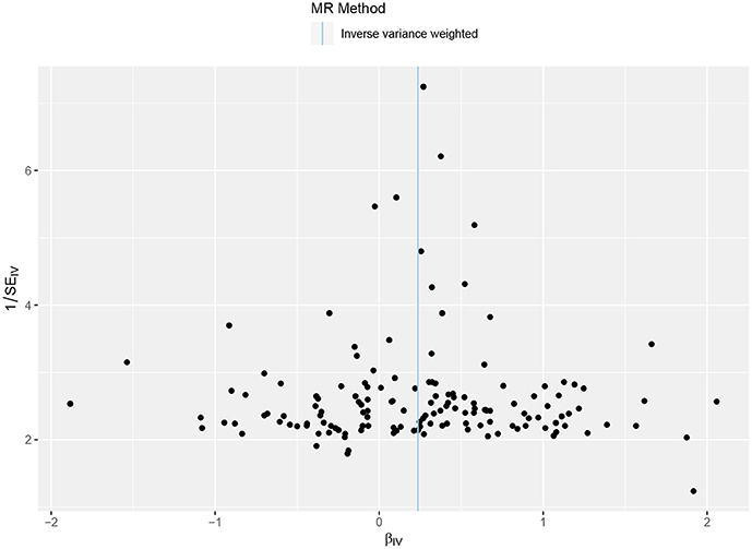 Figure 3. Funnel plot of the Mendelian randomization analysis. The X axis presents the estimate of the causal effect, and the Y axis presents the relevant inverse standard error. The dots indicate each SNP, and the line indicates the overall estimate using IVW method. SNP, single-nucleotide polymorphism; IVW, inverse variance-weighted.