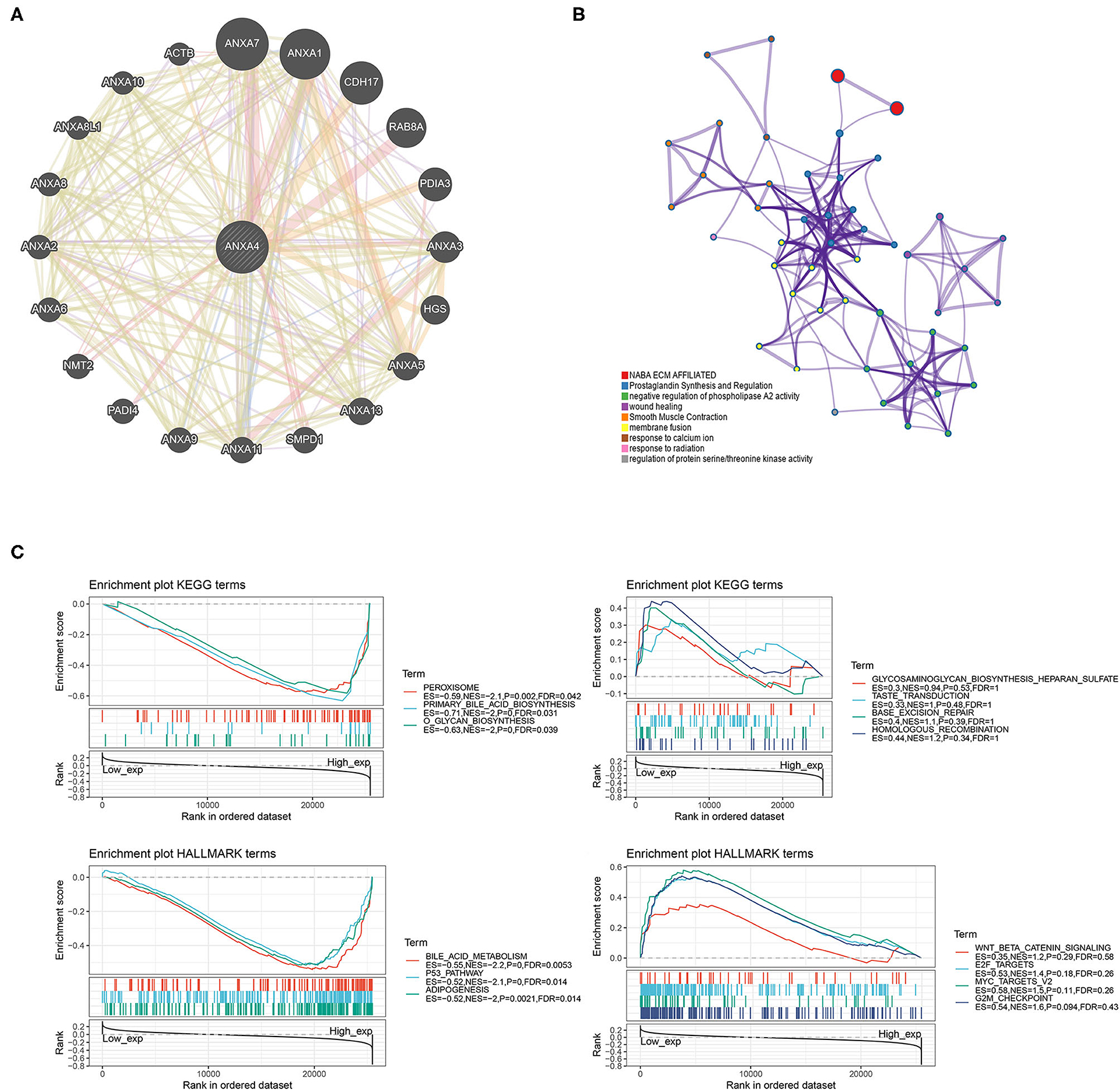 Figure 8. Protein-protein interaction (PPI) network and enrichment analysis (GSEA). (A) Construction of a PPI network with 21 genes centered on ANXA4. (B) Enrichment analysis using Matescape. (C) Gene set enrichment analysis (GSEA).