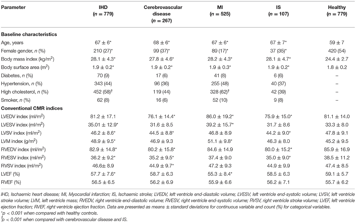 Baseline characteristics and CMR indices for each disease group and healthy controls are shown in Table 1.