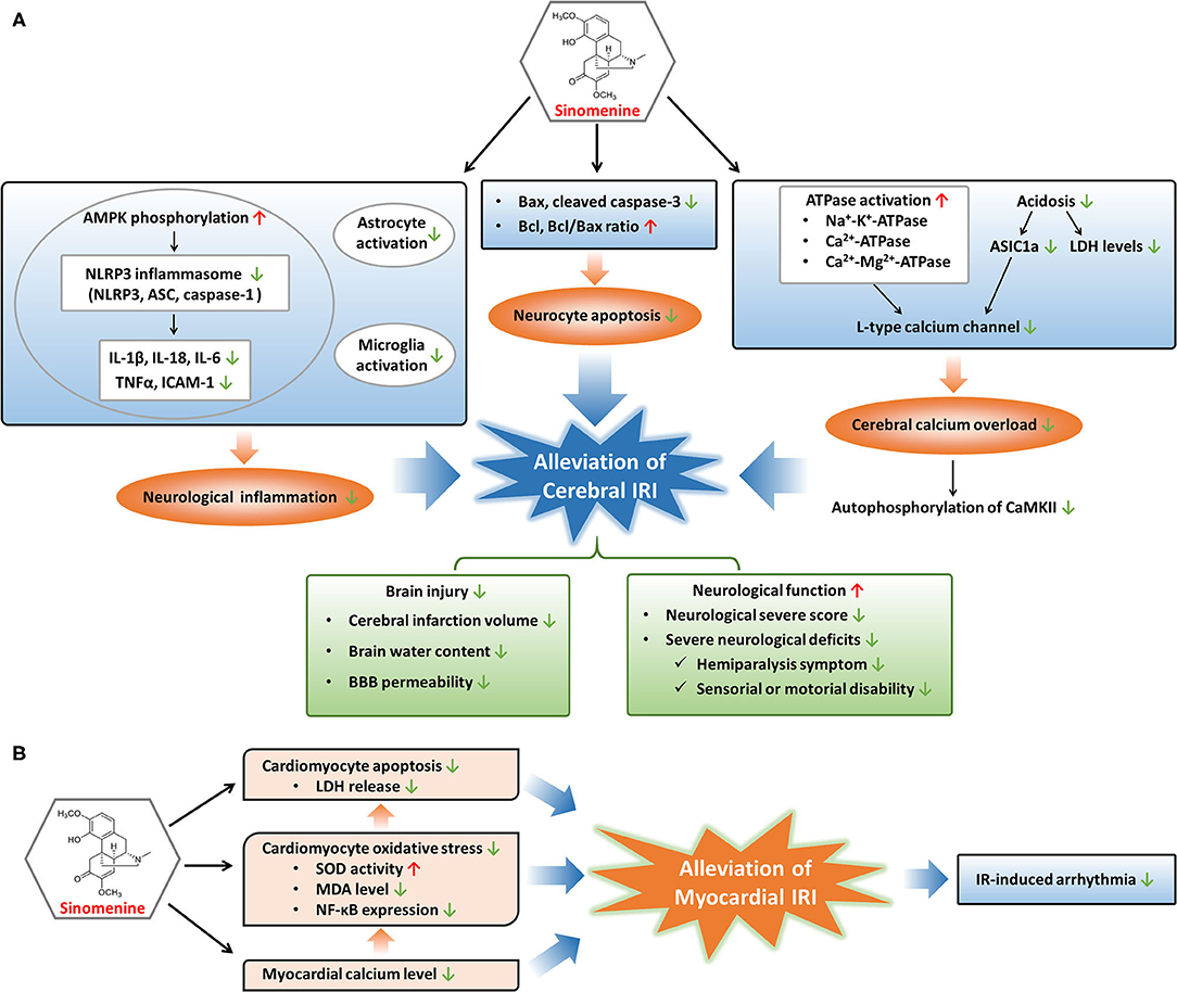 Figure 2. Modulatory mechanisms and protective effects of sinomenine in cerebral and myocardial IRI. (A) Sinomenine may alleviate cerebral IRI through inhibition of neurological inflammation, neurocyte apoptosis, and calcium overload in the cerebrum, resulting in the amelioration of brain injury and improvement of neurological function. (B) Sinomenine could mitigate myocardial IRI by suppressing the apoptosis and oxidative stress of cardiomyocytes, as well as lowering myocardial calcium level, further leading to the reduction of IR-induced arrhythmia. Red upward arrows represent stimulation by sinomenine, and green downward arrows represent inhibition by sinomenine.