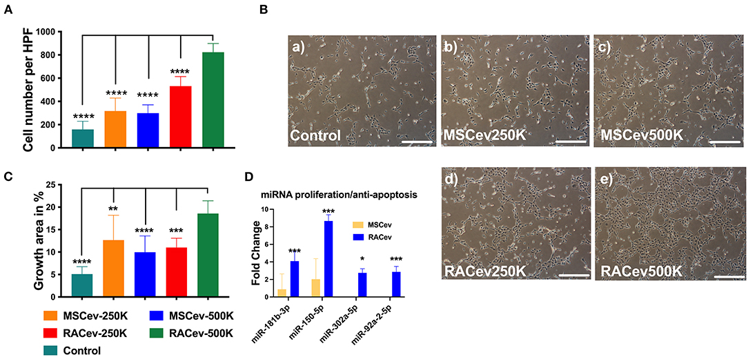 Figure 2. RACev enhanced endothelial cell proliferation in a dose-dependent manner. (A,B) 5 *105 RACs-derived EVs (500K) increased the cell numbers and (B,C) growth area in culture dishes. (D) The miRs responsible for proliferation and anti-apoptosis were markedly upregulated in RACev vs. MSCev. * P < 0.05; ** P < 0.01; *** P < 0.001; **** P < 0.0001 for RACev-500K vs. other groups. Statistical significance was determined using one way ANOVA followed by Tukey's multiple comparison test. The results are presented as mean ± SEM (n = 7–10 per group).