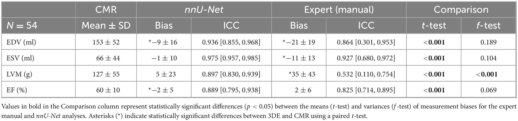 Paired-sample t-tests were used to identify statistically significant measurement biases (calculated as index3DE–indexCMR) in cardiac indices derived from 3DE (either by nnU-Net or manually) with respect to those obtained from corresponding CMR analyses, and Bland-Altman plots were used to visualize the agreement between paired variables. The f-test of equality of variances was used to assess the significance of the reduction in the standard deviation of errors when using nnU-Net instead of expert manual analyses in terms of measurement accuracy (with respect to CMR), as well as scan-rescan repeatability. Finally, to assess the reliability between paired measurements, an intraclass correlation coefficient (ICC) using a two-way, mixed effects model for absolute agreement, was calculated for each index. Based on established guidelines (33), threshold values of <0.5, ≥0.5, ≥0.75, and ≥0.9, represented poor, moderate, good, and excellent reliability, respectively. For the quantification of absolute scan-rescan variability due to random measurement error (34), repeatability coefficients with 95% confidence (35) were also computed. All statistical tests were two-tailed and deemed significant for p-values < 0.05, and analyses were performed using IBM SPSS Statistics for Windows (Version 26.0, IBM Corp., Armonk, NY, USA).