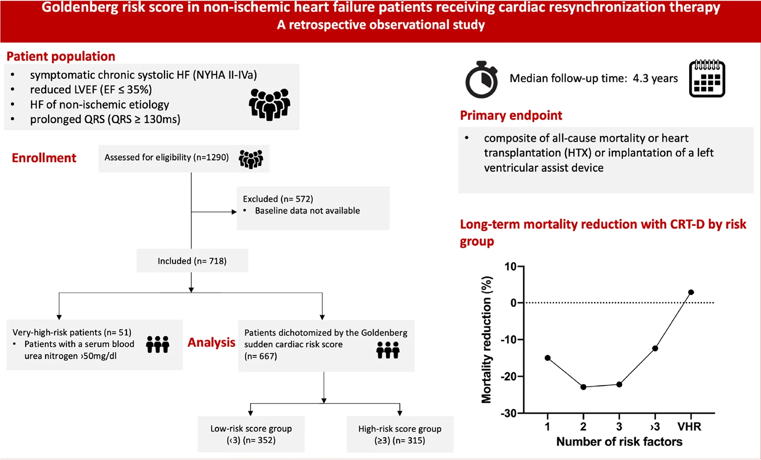 First, we treated separately those, whose se-BUN exceeded 50 mg/dl as very-high-risk (VHR) patients as previously defined at the GRS calculation (12). The risk score comprises five clinically relevant factors [serum blood urea nitrogen (se-BUN > 26 mg/dl, QRS > 120 ms, age > 70, atrial fibrillation, New York Heat Association (NYHA) > II)]. A VHR patient population has been identified and excluded (patients with a se-BUN > 50 mg/dl) as per the original article.