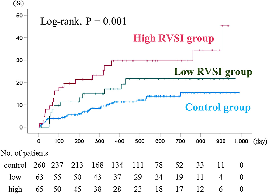 Results: There were significant correlations of RVSI with mean right atrial pressure (mRAP; R = 0.253, P < 0.001), right atrial area (R = 0.327, P < 0.001) and inferior vena cava diameter (R = 0.327, P < 0.001), but not with cardiac index (R = −0.019, P = 0.769). During the follow-up period (median 412 days), cardiac events occurred in 60 patients. In the Kaplan–Meier analysis, the cumulative cardiac event rate increased with increasing RVSI (log-rank, P = 0.001). In the multivariate Cox proportional hazard analysis, the cardiac event rate was independently associated with RVSI (high RVSI group vs. control group: hazard ratio, 1.908; 95% confidence interval, 1.046–3.479, P = 0.035).