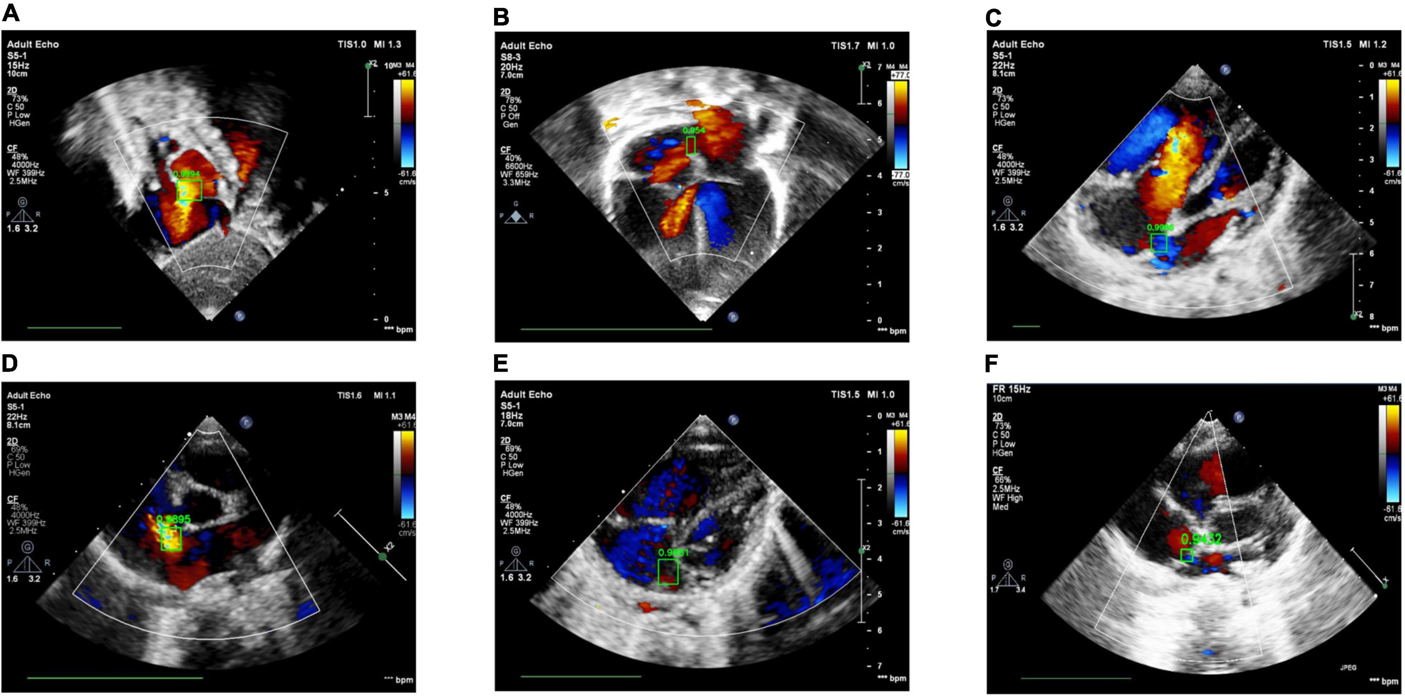 Figure 9. Examples of success and failure cases. (A) ASD detected in the subAS view: bright red shows the transeptal flow with left-to-right shunt, (B) ASD detected in the A4C view: dark red in the center of the atrial septum indicates the occurrence of left-to-right shunt flow, (C) ASD detected in the LPS4C view: blue regions represent the transeptal flow with right-to-left shunt, (D) ASD detected in the PSAX view: bright red shows the transeptal flow with left-to-right shunt. (E) ASD detection of false positive, due to the confusion of similar structures and the failure of the cardiac anatomy segmentation stage; (F) ASD detection of true negative, due to the low confidence (0.9432 < 0.95).
