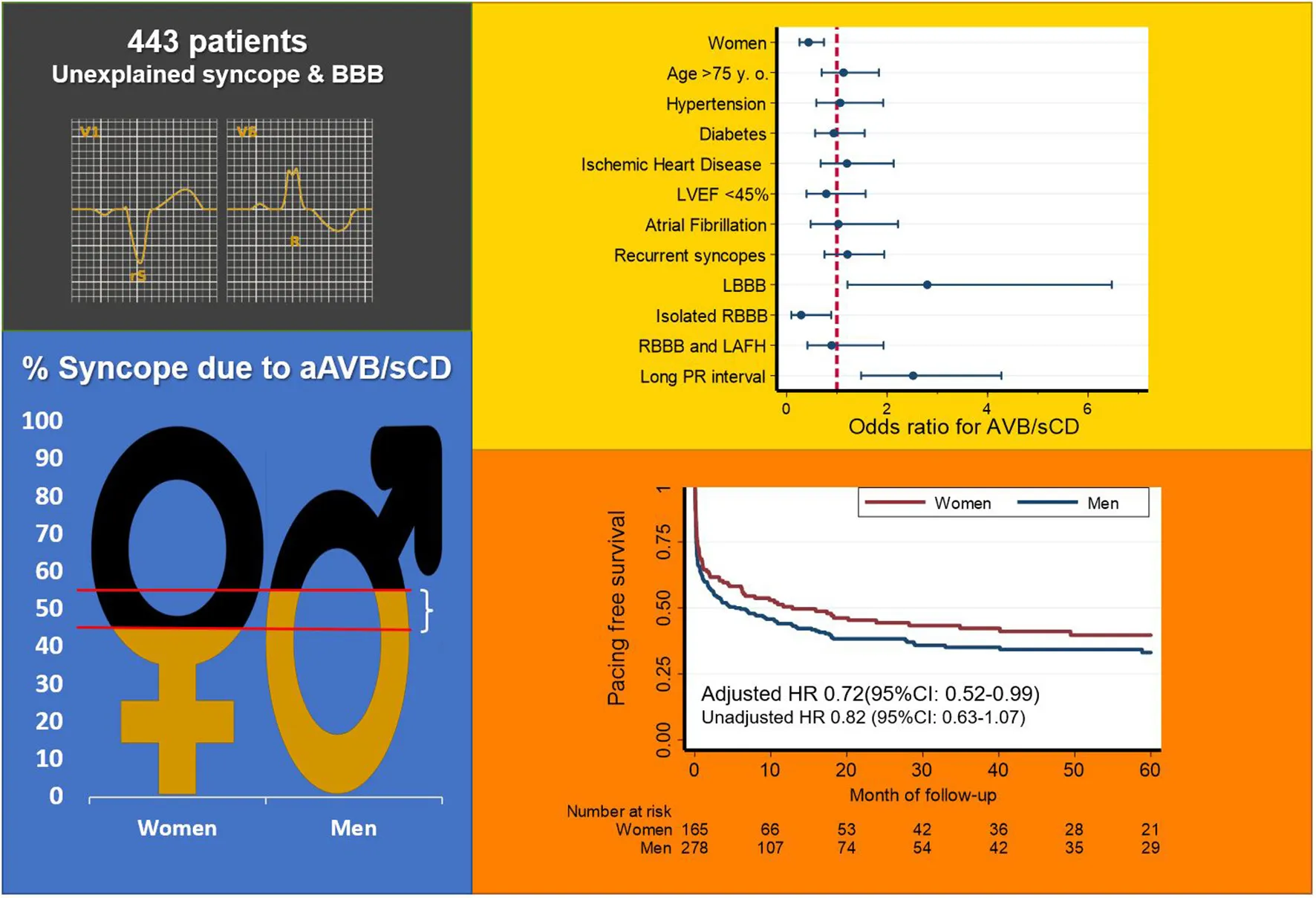Given the susceptibility of women to syncope due to other mechanisms and the different comorbidities of the female sex, we hypothesize that women with unexplained syncope and BBB would have a different risk of aAVB or severe conduction disturbances (sCDs) and a different risk of needing cardiac pacing compared to men. The aim of this study was to analyze the sex-related differences in patients with syncope and BBB concerning the prevalence of aAVB/sCD, the diagnostic yield of tests, and clinical outcomes.