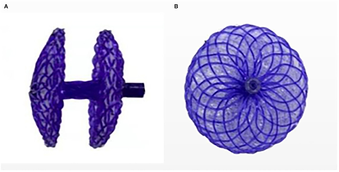 Figure 2. Novel biodegradable Occluder. (A) Side view of the occluder device. (B) Positive view of the occluder device.