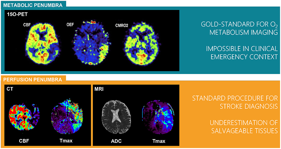 As initially demonstrated with PET imaging, penumbral tissues are described by a relatively preserved O2 metabolism within a region with perfusion deficit. With the change of paradigm operating and promoting tissue based eligibility criteria for reperfusion therapies, there is a need for an operational imaging parameter to evaluate the metabolic state of the tissues. The current knowledge of the field raises legitimate concerns about other imaging modalities providing metabolic parameters.