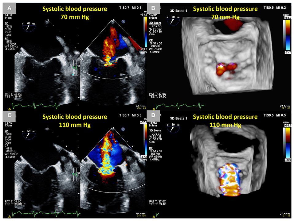 Figure 1. Dynamic changes in SMR during transesophageal echocardiography in a 66-year-old male patient who had an anterior old myocardial infarction and heart failure with reduced ejection fraction. Mild SMR (EROA 0.10 cm2) under sedation using midazolam under a systolic blood pressure of approximately 70 mm Hg. (A) Two-dimensional B-mode and color Doppler images from the intercommissural view and (B) a three-dimensional color Doppler image from the en-face view. Dynamic severe SMR (EROA 0.51 cm2) under an elevated systolic blood pressure of approximately 110 mm Hg using norepinephrine. (C) Two-dimensional B-mode and color Doppler images from the intercommissural view and (D) a three-dimensional color Doppler image from the en-face view. SMR, secondary mitral regurgitation; EROA, effective regurgitant orifice area.