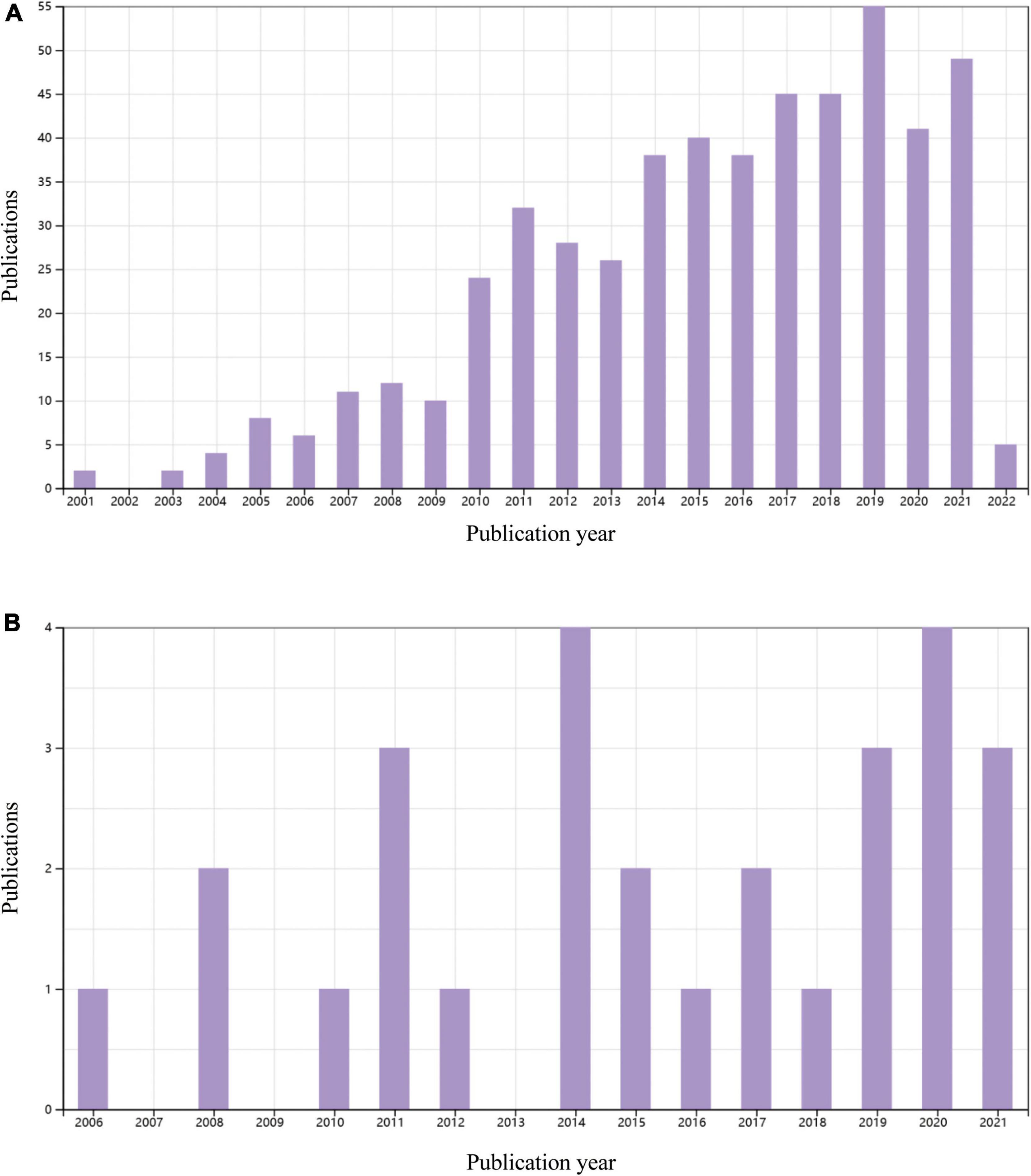 Figure 3. Original publications over time related to cardiac regenerative research in rodents with permanent myocardial infarction of myocardial ischemia/reperfusion in the last 20 years. (A) 521 papers on a permanent myocardial infarction model. Data source: Web of Science, searched with the topics “myocardial infarction” AND (”cardiac regeneration” OR “heart regeneration”) and then refined by document type “Articles” and MeSH headings of “Animals.” (B) 28 articles using a myocardial ischemia/reperfusion model. Data source: Web of Science, searched with the topic “ischemic/reperfusion” AND (”cardiac regeneration” OR “heart regeneration”) and then refined by document type “Articles” and MeSH headings of “Animals.” Reviews, meeting papers, and editorial materials were excluded from both (A,B).