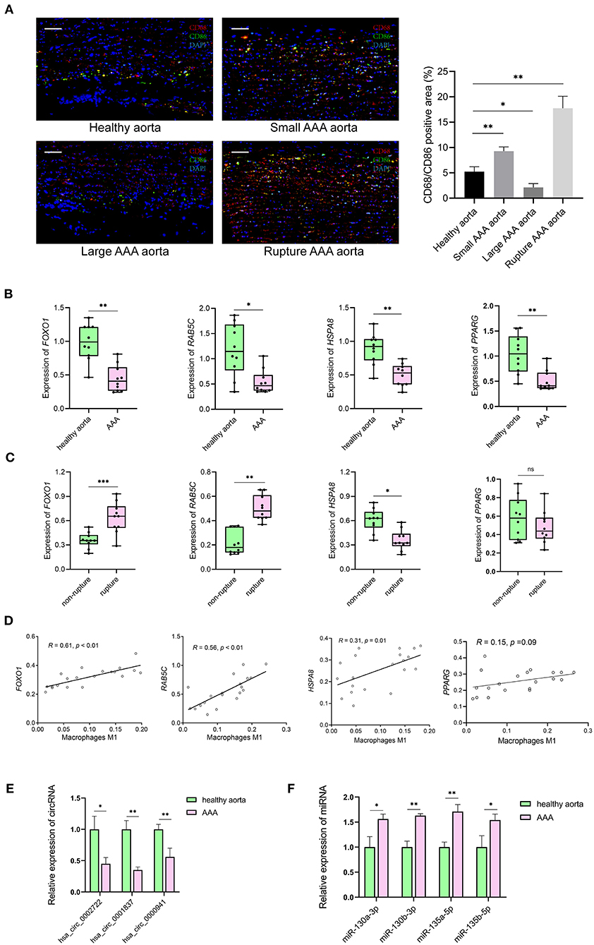Figure 8. The results of preliminary clinical specimen validation. (A) Immunofluorescence staining of CD68 (red), CD86 (green) and DAPI (blue) in tissue samples of patients with AAA and controls. Scale bar = 100 μm. *p < 0.05, **p < 0.01, Student's t-test. (B) The expression levels of RAB5C, HSPA8, FOXO1, PPARG genes in tissue samples of AAA vs. controls. n = 10 in each group, *p < 0.05, **p < 0.01, Student's t-test. (C) The expression levels of RAB5C, HSPA8, FOXO1, PPARG genes in tissue samples of non-rupture AAA vs. rupture AAA. n = 10 in each group, *p < 0.05, Student's t-test. (D) Correlation curves between the levels of M1 macrophages and key genes in tissue samples of patients with AAA and controls. Total n = 20. (E) Quantification of the relative expression levels of hsa_circ_0002722, hsa_circ_0001837, hsa_circ_0000941 in tissue samples of AAA vs. controls. n = 3 in each group, *p < 0.05, **p < 0.01, Student's t-test. (F) Quantification of the relative expression levels of miR-130a-3p, miR-130b-3p, miR-135a-5p, miR-135b-5p in tissue samples of AAA vs. controls. n = 3 in each group, *p < 0.05, **p < 0.01, Student's t-test.