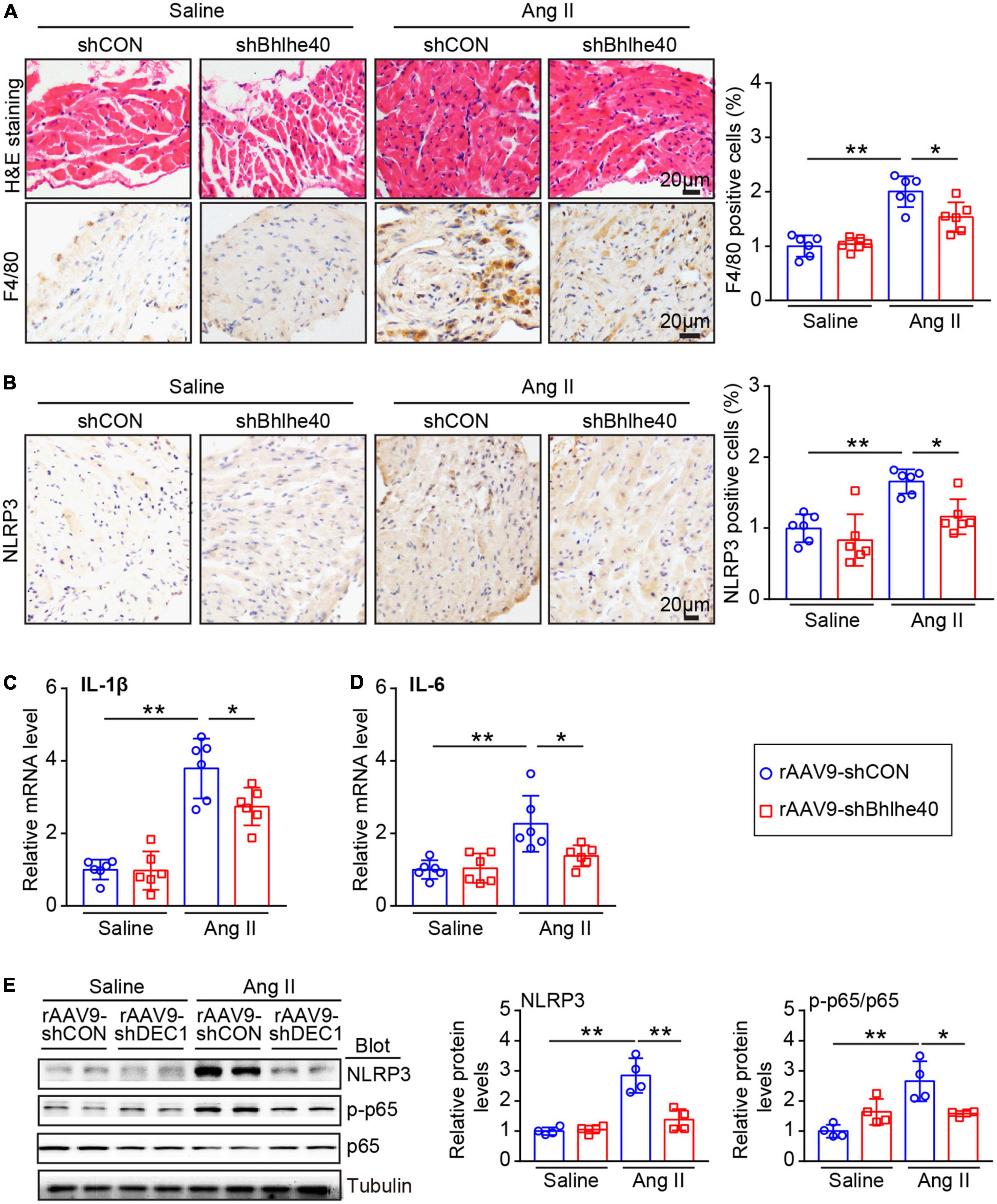Figure 6. Knockdown of Bhlhe40 by rAAV9-shBhlhe40 injection suppresses Ang II-induced atrial inflammation. (A) Representative hematoxylin–eosin (H&E) staining (top in left), IHC staining of F4/80 (bottom in left), and the quantification of F4/80-positive cells (right) from the IHC-stained sections from the rAAV9-shCON/rAAV9-shBhlhe40-treated and Ang II/saline-infused atrial tissues (n = 6 mice per group). (B) Representative images of NLRP3 immunohistochemistry (left) and the quantification of NLRP3-positive cells (right; n = 6 mice per group). (C,D) qPCR analyses of pro-inflammatory cytokine levels (IL-1β and IL-6) in atrial tissues (n = 6). (E) Immunoblotting analyses (Left) and quantification of ion channel subunits and connexin (Kv4.3and CX43) in atrial tissues (n = 4). Tubulin served as an internal control. n indicates the number of animals. *P < 0.05 and **P < 0.01.