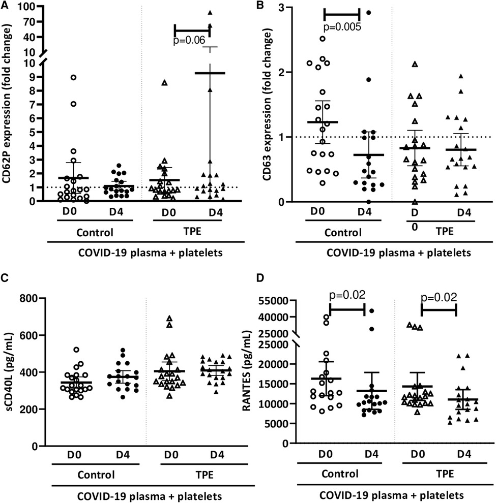 Figure 3. Effect of COVID-19 control and TPE plasma on platelet activation in a platelet/endothelial co-culture. Membrane expression of CD62P (A) and CD63 (B) and release of sCD40l (C) and RANTES (D) by platelets were assessed following 24 h-exposure of the endothelial cell monolayer co-cultured with healthy platelets to COVID-19 D0 or D4 control or TPE plasma for 24 h (n = 9−10, each plasma tested with platelets from two independent donors, each data point corresponds to an individual data point). Relative CD62P and CD63 platelet expression was expressed as a ratio (fold change) in relation to the co-culture exposed to the culture medium. The release of sCD40l and RANTES by platelets following exposure to COVID-19 plasma was expressed in pg/mL and calculated by subtracting the amount of these factors present in plasma from the total amount assessed in the co-culture supernatant after stimulation. Data are presented as individual values with the point estimate of mean ± the margin of error around the mean defining the 95% confidence interval. The non-parametric Wilcoxon matched-pairs signed rank test was used to assess the significance of changes in parameters over time. p < 0.05 was considered significant.