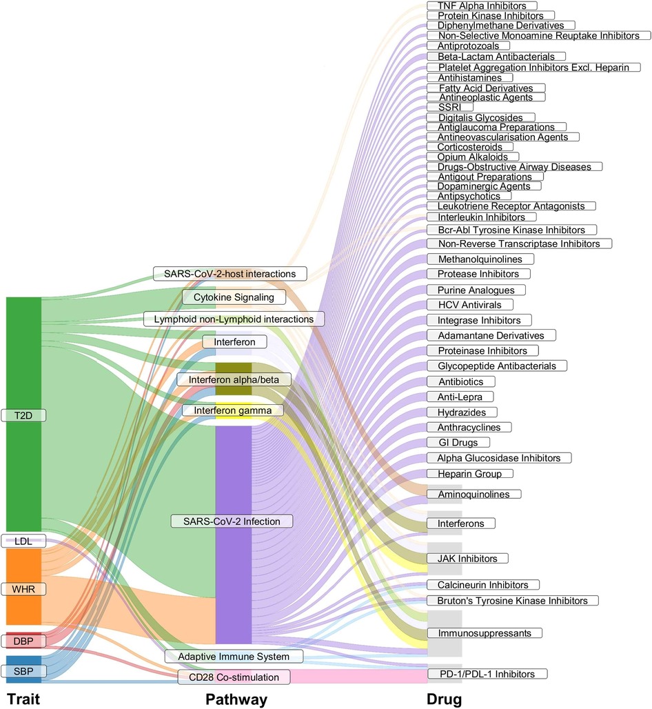 Figure 3. Pathway enrichment analysis. The Sankey plot illustrates enriched pathways (middle column) in the list of genes that had expression levels associated with the genetic instruments for the considered exposure traits (left column). The right column details drugs involved in the enriched pathways. SBP, systolic blood pressure; DBP, diastolic blood pressure; WHR, waist-to-hip ratio; LDL, low-density lipoprotein cholesterol; TG, triglycerides; T2DM, type 2 diabetes. SARS-CoV-2, severe acute respiratory syndrome coronavirus 2; TNF, tumor necrosis factor; SSRI, selective serotonin reuptake inhibitor; HCV, hepatitis C virus; GI drugs, gastrointestinal drugs; JAK Inhibitors, Janus kinase inhibitors; PD-1/PDL-1, programmed cell death protein 1 and programmed death ligand 1.
