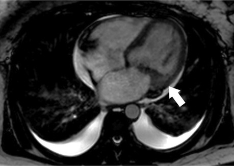 Figure 3. Libman-Sacks endocarditis on CMR. Cine 4-chamber view shows mass-like mitral valve vegetation and valve thickening (white arrow) consistent with Libman-Sacks endocarditis.