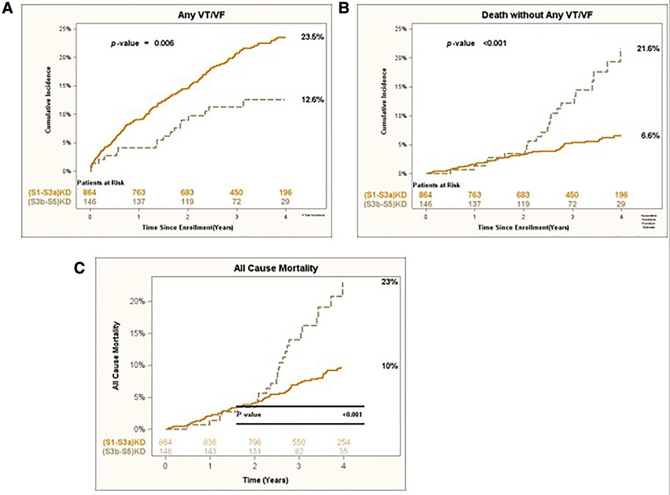 Results: The cumulative incidence of Any VT/VF was 23.5% in patients with (S1-S3a)KD and 12.6% in those with (S3b-S5)KD (p < 0.001) The incidence of Death without Any VT/VF was 6.6% in patients with (S1-S3a)KD and 21.6% in patients with (S3b-S5)KD (p < 0.001). A Fine and Gray multivariate competing risk regression model showed that Patients with (S3b-S5)KD had a 43% less risk of experiencing Any VT/VF when compared to those with (S1-S3a)KD (HR = 0.56, 95% CI [0.33–0.94] p = 0.03. After two years of follow up, there was almost a 5-fold increased risk of Death without Any VT/VF among patients with (S3b-S5)KD when compared to those with (S1-S3a)KD [HR = 4.63, 95% CI (2.46–8.72), p for interaction with time = 0.012].