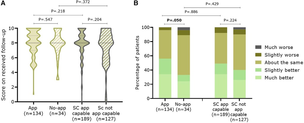 Patients gave a median score of 8.0 (IQR7.0–9.0)(mean: 7.8 ± 1.9) on ten about perceived quality of follow-up they received during the year of study, with a median score of 8.0 (IQR:7.0–9.0) in the App ITT group (n = 168; mean: 8.1 ± 1.7) compared to 8.0 (IQR:7.0–9.0) in the SC group (n = 316; mean: 7.7 ± 2.0; P = .072) (Figure 5A). In addition, patients could indicate how they perceived the evolution of their health over the past year. There was no significant difference between the App ITT and SC groups (P = .529) (Figure 5B). However, most patients considered their health the same or better. When asked which follow-up methods patients would prefer for future care, the weighted percentage showed that follow-up by a physician was most chosen in both groups (App ITT: 39.0%, SC: 47.9%; P = .112) (Figure 5C). Significantly more patients in the App ITT group would prefer follow-up with an application (26.1%) compared to the SC group (8.5%; P < .001).