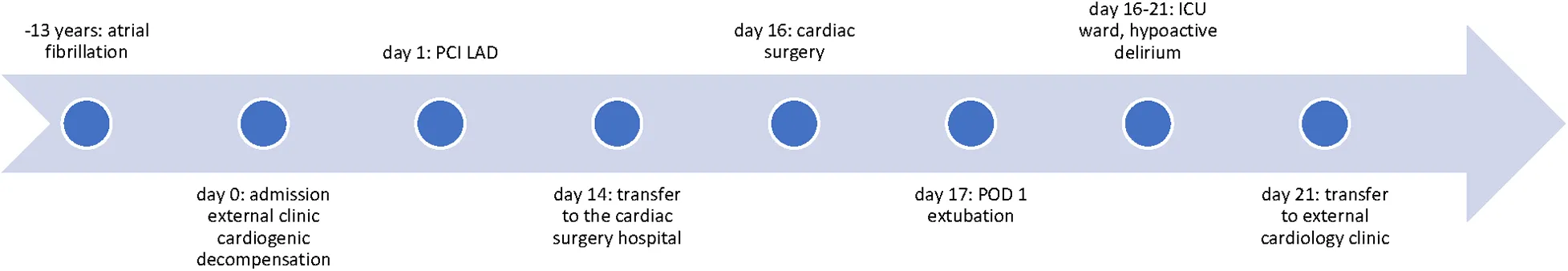 Under catecholamine and inotropic support, the patient was transferred to our intensive care unit. After careful weaning, extubation was possible on the first postoperative day. Due to a slight hypoactive delirium, ICU observation was necessary for the first 5 days, and in a stable hemodynamic situation, the patient was then transferred to the external cardiology department for further treatment.
