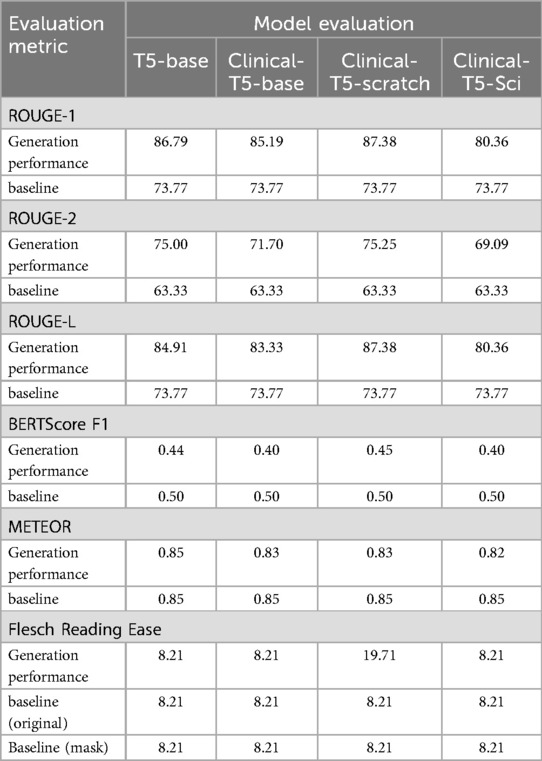 Unlike the transformer decoder, which uses an auto-regressive model, BERT is trained based on the masked language model (MLM) (34). It masks the word in the input sequence and uses the bidirectional encoder to understand the context semantically, which will be used in predicting the masked word (58). It has already been pre-trained on a 16 GB corpus. To deploy it, we only need to replace the original fully connected layer with a new output layer and then fine-tune the parameters on the dataset for specific tasks (58). This approach consumes fewer computing resources and less time than training a model from scratch. In the clinical domain, Bio_ClinicalBERT (59) and medicalai/ClinicalBERT (60) are fine-tuned in the clinical dataset based on the BERT architecture. Initially, due to BERT's focus on semantic understanding, it was rarely used for text generation (61).