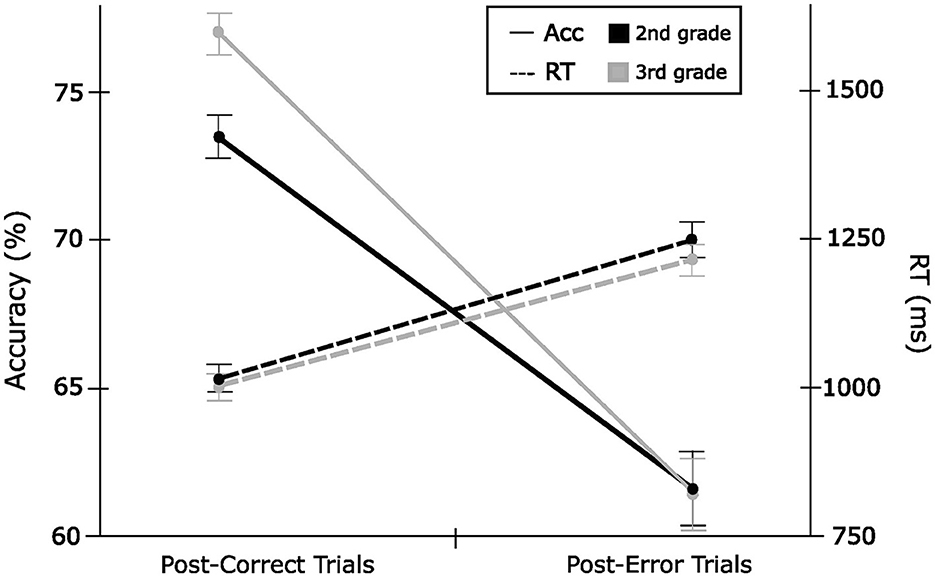 Figure 2. Mean accuracy rates and median response times after errors and correct trials for 2nd and 3rd grade in the working memory task.