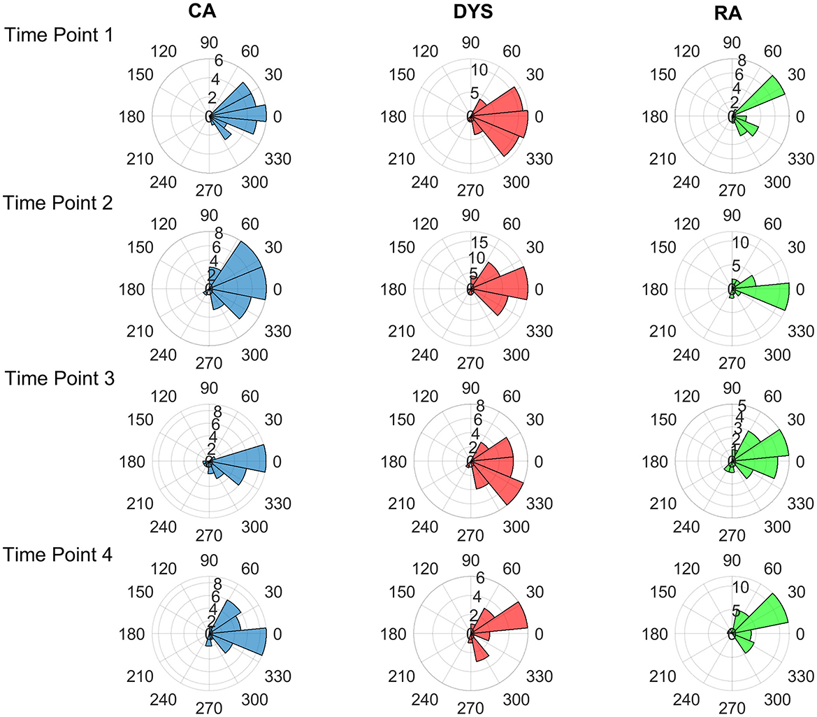 Figure 2. Polar histograms of tapping phase at Time Points 1–4 for synchronizers in each group, chronological-age-matched controls (CA), those with dyslexia (DYS), and reading-age-matched controls (RA).