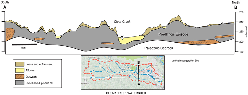 Figure 3. Cross-section of the eastern portion of the Clear Creek Watershed, Iowa. (A,B) Inset map shows the location of the cross-section within the Clear Creek Watershed, outlined in red. Pre-Illinois Episode tills of the Alburnett and Wolf Creek formations occupy broad bedrock valleys cut into Devonian bedrock. Sand and gravel bodies, interpreted as glacial outwash, are present within and between these till units. At the surface, thick deposits of loess dating to the late Wisconsin—earliest Holocene are present along with alluvium deposited in modern river valleys.