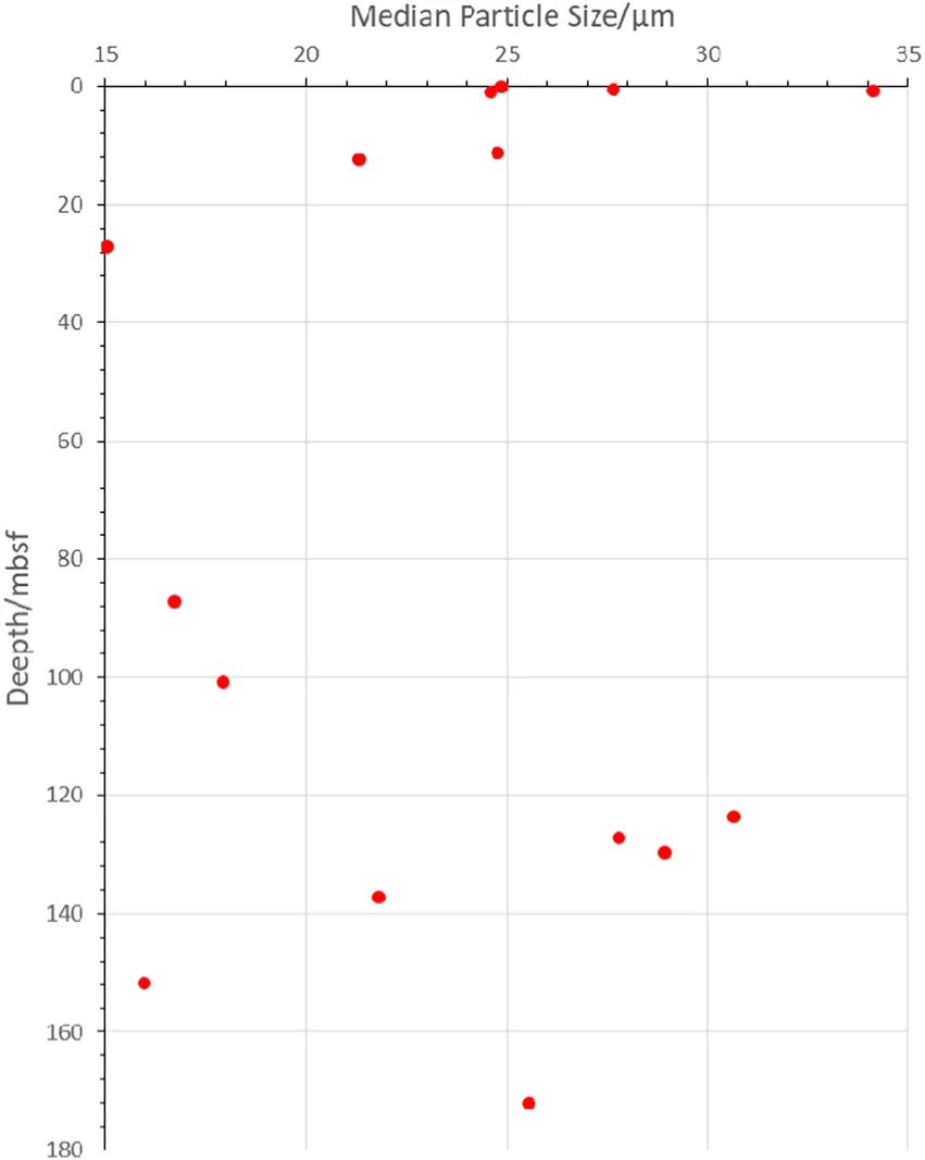 The particle size analysis results are presented in Table 2. The results show that 1) the median grain size of the sediments ranges from 15.1 to 34.1 μm, and the median grain size is concentrated in the range of 21.3–28.9 μm (9/15), indicating that the reservoirs are composed of silty sediments. 2) At sampling depths of 0.8 mbsf and 123 mbsf, the median grain size of the reservoir is 30–34 μm. Combined with the Cone Penetration Test (CPT) stress characteristics at the corresponding depth, the analysis results indicate that the reservoir is composed of carbonate crust or a small amount of silty deposits, reflecting ancient cold seep activity. 3) The grain size of the sediments varies little with depth, indicating that the sedimentary environment is Quaternary deep-sea suspended sediments, and large-scale silty and sandy deposits are not present.