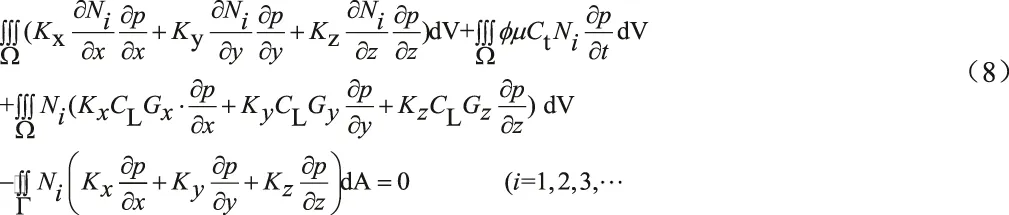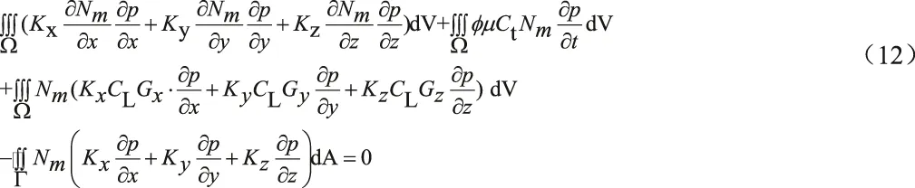where Ni and Nʹi are interpolation functions, Ω is the integral range, and is the integral boundary. The region Ω is divided into E units and n nodes. Then, the continuous pressure field was dispersed to n nodes. Finally, the pressure of each node at different times is solved. In this study, the stratum media region is divided by any tetrahedral units (three-dimensional), and the fracture media region is divided by any triangular elements (two-dimensional). The pressure in the cell is linearly distributed, and the pressure expression is calculated and sorted out as follows.where pi, pj, pk, and pl are the pressure values of each node of the tetrahedral element, Mpa; pfi, pfj, and pfm are the pressure values of each node of the triangular element, Mpa; Ni, Nj, Nk, Nl, Ni’, Nj′, and Nm′ are interpolation basis functions, which are only related to node coordinates.