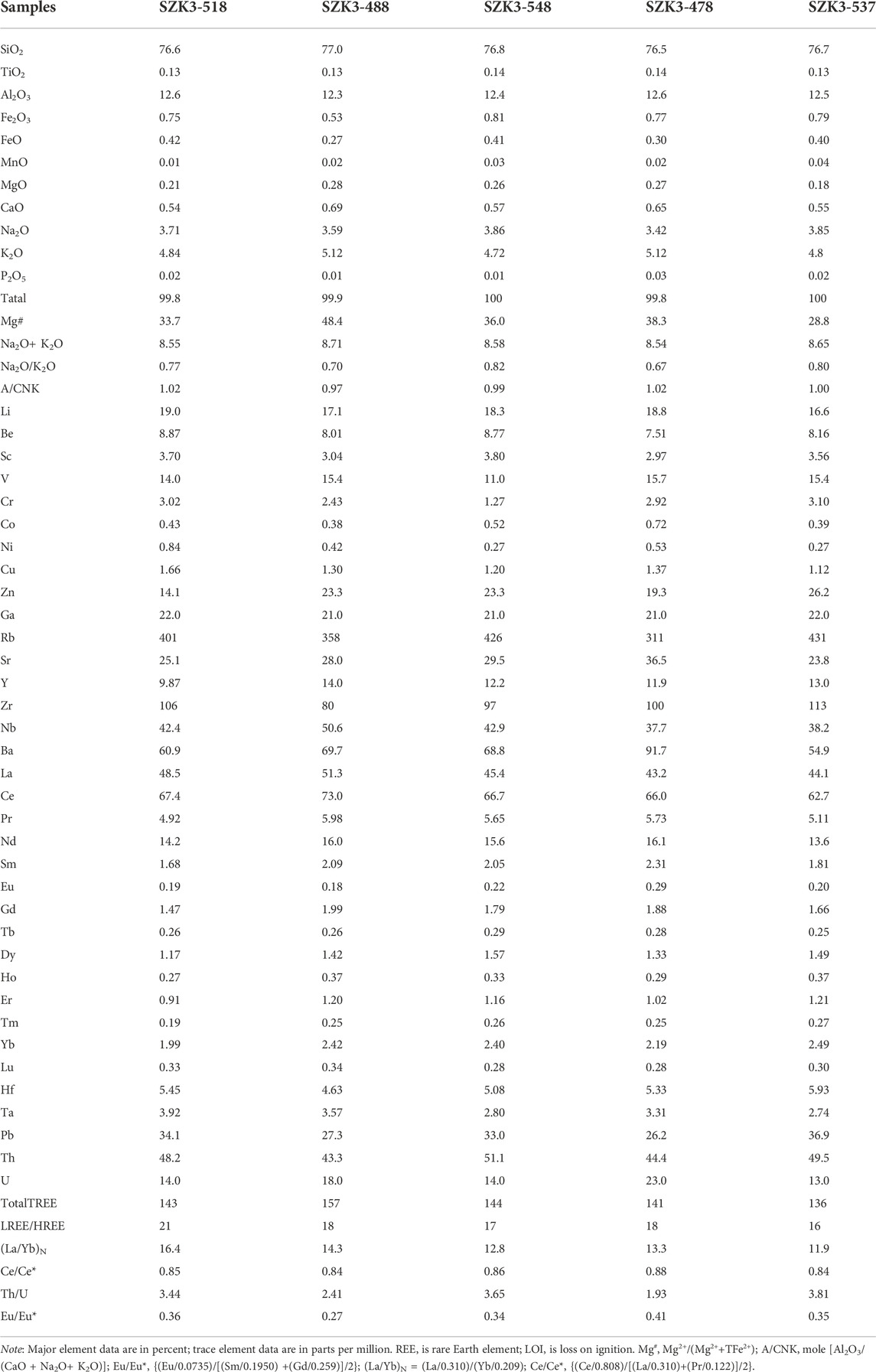 The whole-rock compositions of granite samples were completed in Beijing GeoAnalysis Technology Co.,Ltd. by X-ray fluorescence (XRF–1800; SHIMADZU) on fused glasses and inductively coupled plasma mass spectrometry (7,500; Agilent) after acid digestion of samples in Teflon bombs. Loss on ignition was measured after heating to 1,000°C for 3 h in a muffle furnace. The precision of the XRF analyses is within ±2% for the oxides greater than 0.5 wt% and within ±5% for the oxides greater than 0.1 wt%. Sample powders (about 40 mg) were dissolved in Teflon bombs using a HF + HNO3 mixture for 48 h at about 190 °C. The solution was evaporated to incipient dryness, dissolved by concentrated HNO3 and evaporated at 150°C to dispel the fluorides. The samples were diluted to about 80 g for analysis after re-dissolved in 30% HNO3 overnight. An internal standard solution containing the element Rh was used to monitor signal drift during analysis. Analytical results for USGS standards indicated that the uncertainties for most elements were within 5%. The whole-rock geochemical data are presented in Table 2.