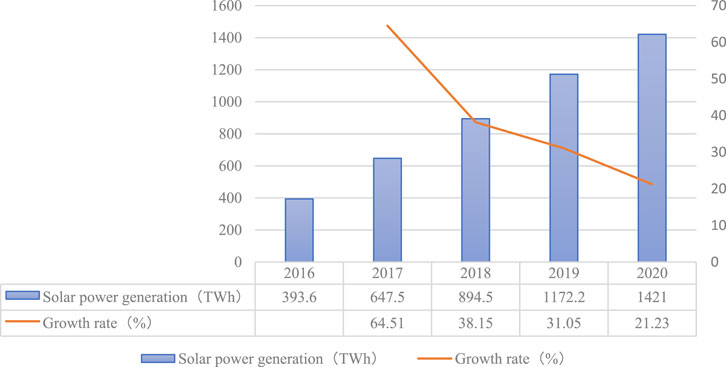 Figure 5. China’s solar energy capacity, 2016–2020. Data source: National Bureau of Statistics of China.