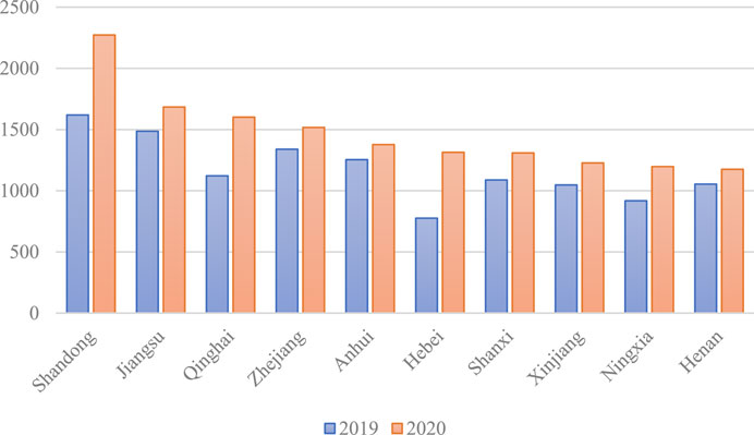 As a human life resource, solar energy plays an increasingly important role in the development of rural areas (Liu et al., 2023). Figure 6 shows the top 10 provinces with grid-connected PV capacity in 2020. As can be seen in the figure, Shandong, Jiangsu, Qinghai, Zhejiang, and other regions have a higher grid-connected capacity, followed by Anhui, Hebei, Shanxi, Xinjiang, Ningxia, and Henan.