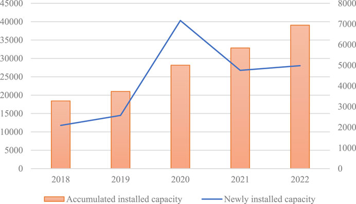 Figure 7. China’s accumulated installed capacity and new capacity of wind power generation from 2018 to 2022 (10 MW). Data source: China Wind Power Market Current Situation In-depth Research and Future Prospects Analysis Report (2023–2030).
