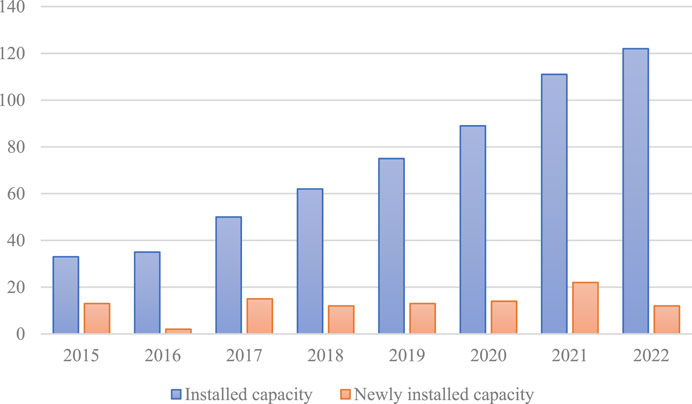 Figure 9. Installed capacity and new capacity of biogas power generation from 2015 to 2023 (10 MW). Data source: China Biomass Energy Industry Development Yearbook (2023).