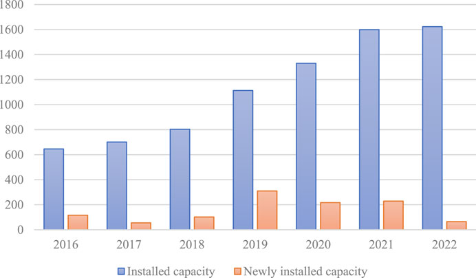 Figure 10. Installed capacity and newly added capacity of agricultural and forestry biomass power generation in 2016–2022 (10 MW). Data source: China Biomass Energy Industry Development Yearbook (2023).