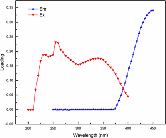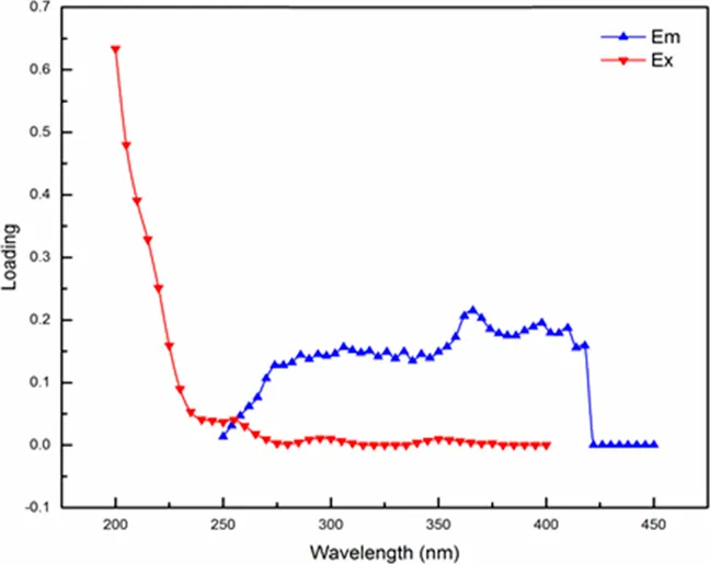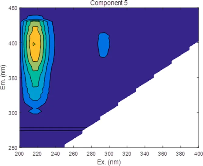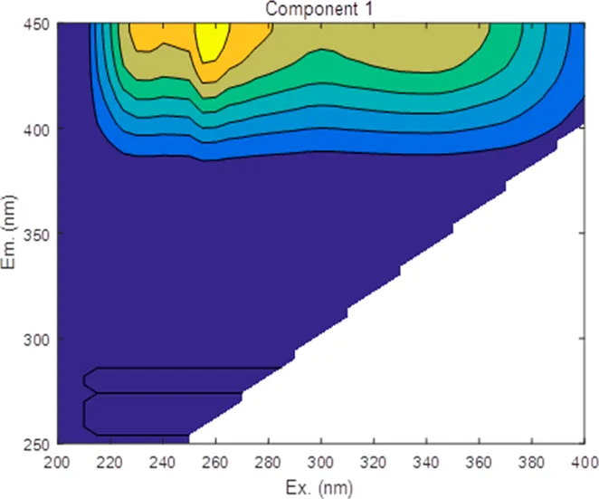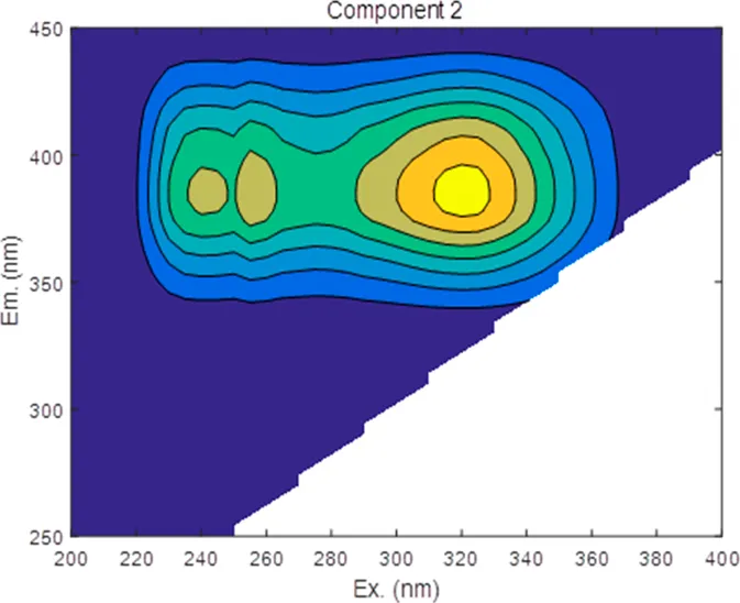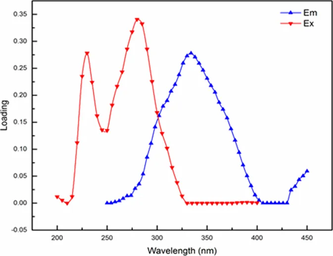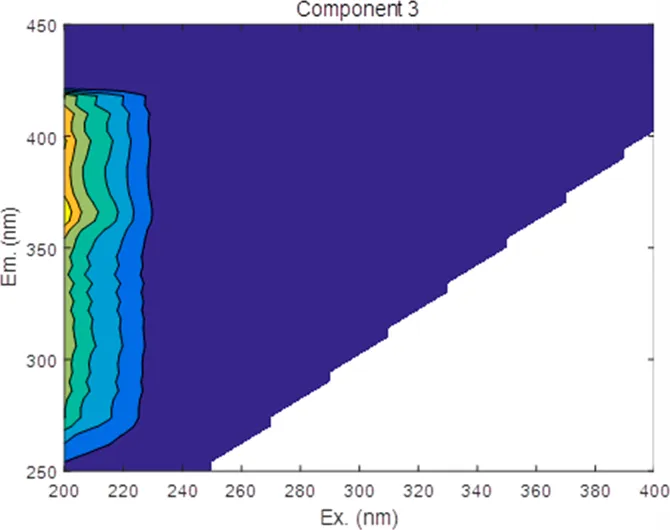 | Component | Wavelengths | EEM location | Spectral loadings |