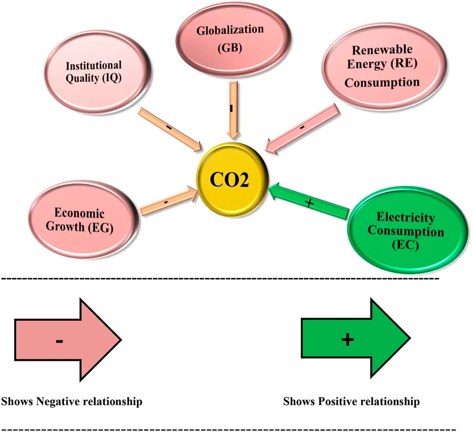 Khan et al. (2019), Qin et al. (2022), Liu S. et al. (2022) investigated the effect of consumption of traditional energy sources on CO2 emission in Pakistan. Study findings reveal that energy consumption and CO2 emission are positively correlated. Similarly, another study by Khan et al. (2020) concluded that CO2 emission has a positive influence on the consumption of traditional energy sources and EG. Adedoyin et al. (2020), Munir et al. (2020), Liu Y. et al. (2022), Yin et al. (2022) also checked the impact of EG on CO2 emission and concluded that EG and CO2 are positively correlated in Asian countries.