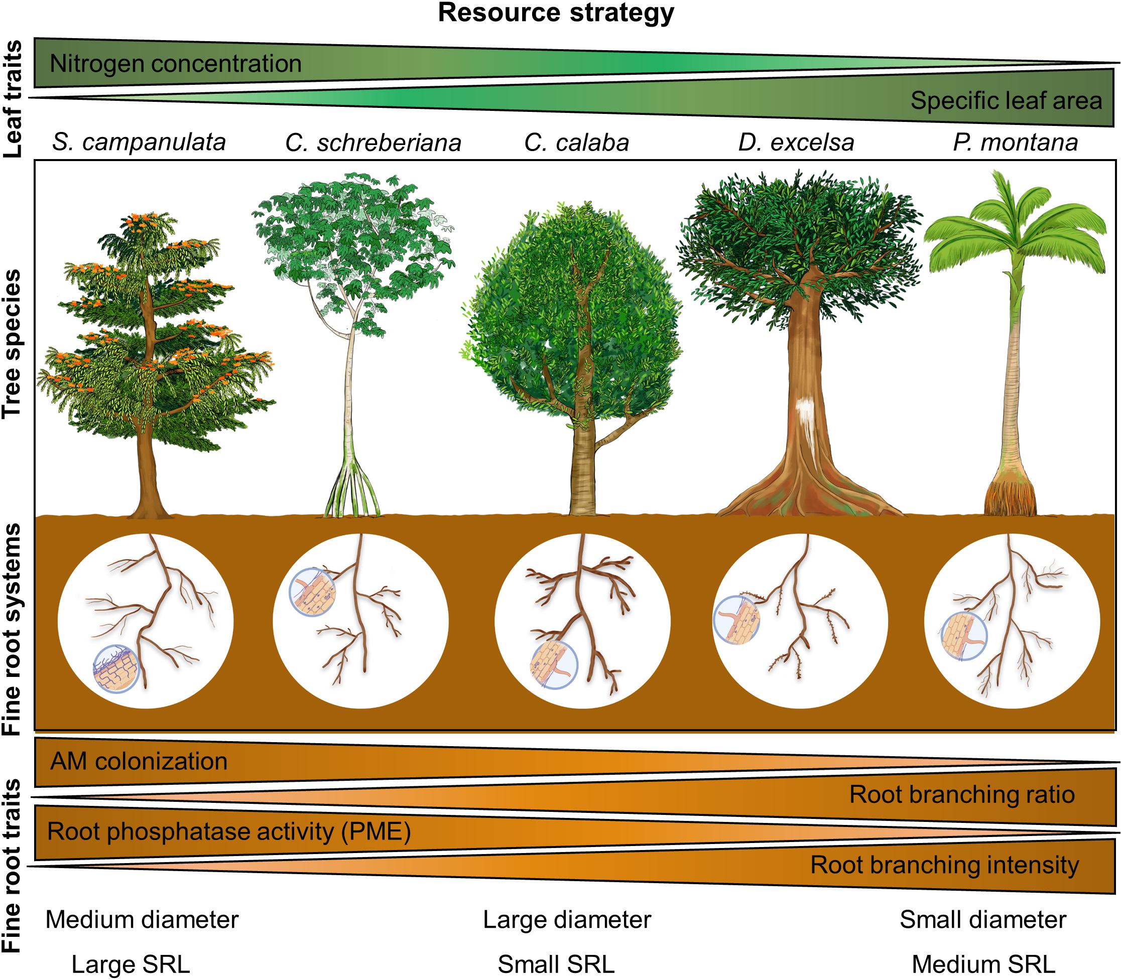 Figure 6. Conceptual diagram of belowground phosphorus-acquisition strategies of five tropical tree species from Puerto Rico. Our results highlight a trade-off between highly colonized fine roots with high phosphatase activity and fine roots that have a high degree of branching. Furthermore, the former strategy is adopted by pioneer species (Spathodea campanulata and Cecropia schreberiana), whereas the latter is adopted by non-pioneer species (mostly Dacryodes excelsa and Prestoea montana). Root phosphorus concentration was not included here because no clear pattern was found across species.