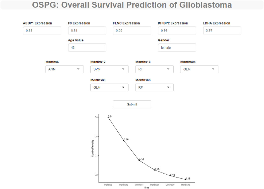 To make these constructed machine learning models accessible to GBM researchers, we developed a web tool to predict the survival probability of GBM patients called OSPG. OSPG can be used in five steps 1) visiting the website https://ospg.shinyapps.io/OSPG/;(2) inputting the values of five genes, including AEBP1, F3, FLNC, IGFBP2, and LDHA (gene expression values range 0–1); 3) inputting the values of age and gender (male or female); 4) selecting the machine learning models for each time point (6, 12, 18, 24, 30, and 36 months), and 5) clicking the “submit” button. An example is illustrated in Figure 7.
