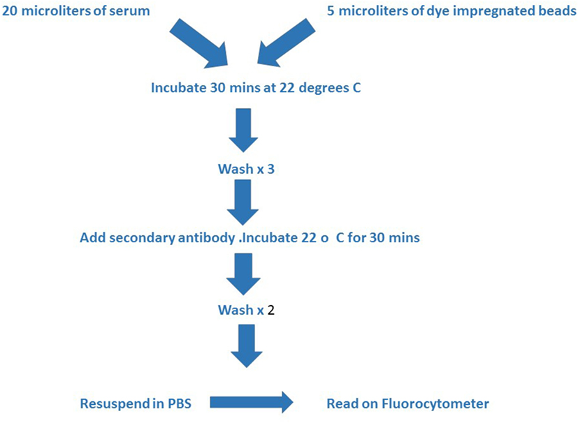 Figure 2. The figure outlines the technical steps involved in the assay. The test serum and beads are incubated together at room temperature for 30 min and then washed three times with buffer prior to adding the second antibody. A second incubation period of 30 min at room temperature is followed by two further washes with buffer and then the mixture is resuspended in phosphate buffered saline for reading in the Luminex instrument.