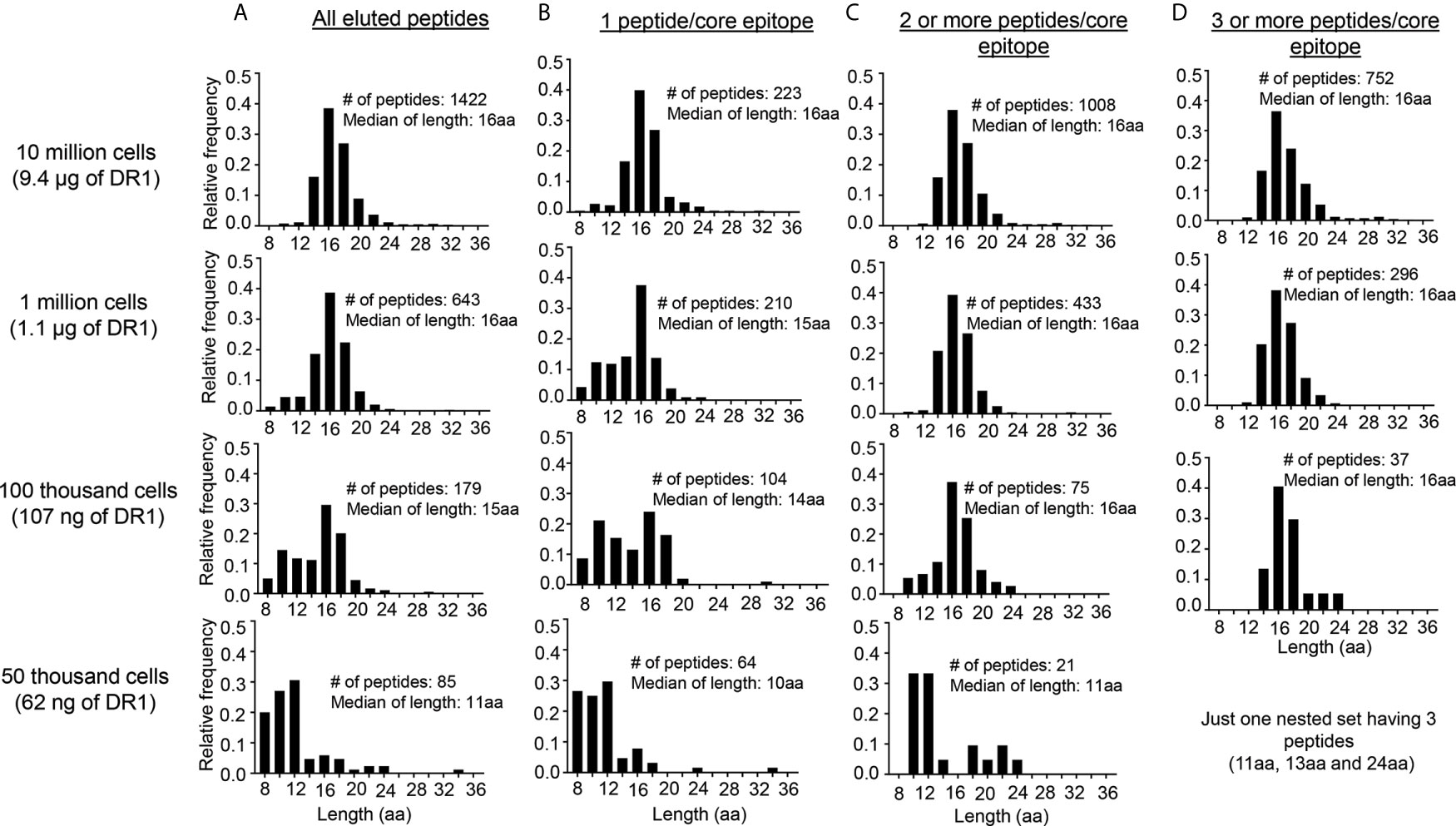Figure 4 Length distribution of peptides eluted from LG2 cells with different numbers of sequences per core epitope. (A) All of the peptides eluted from 10 million, 1 million, 100 thousand and 50 thousand cells. NetMHCIIpan 3.2 was used for predicting the 9-residue binding frame from all peptides eluted from different numbers of LG2 cells. All peptides having identical predicted binding frames were considered as a single core epitope. (B) Length distribution for peptides having 1 peptide/core epitope from different numbers of LG2 cells. (C) Length distribution for peptides having 2 or more peptides/core epitope and (D) Length distribution for peptides having 3 or more peptides/core epitope. The number of peptides and median of length distribution for each set has been indicated.