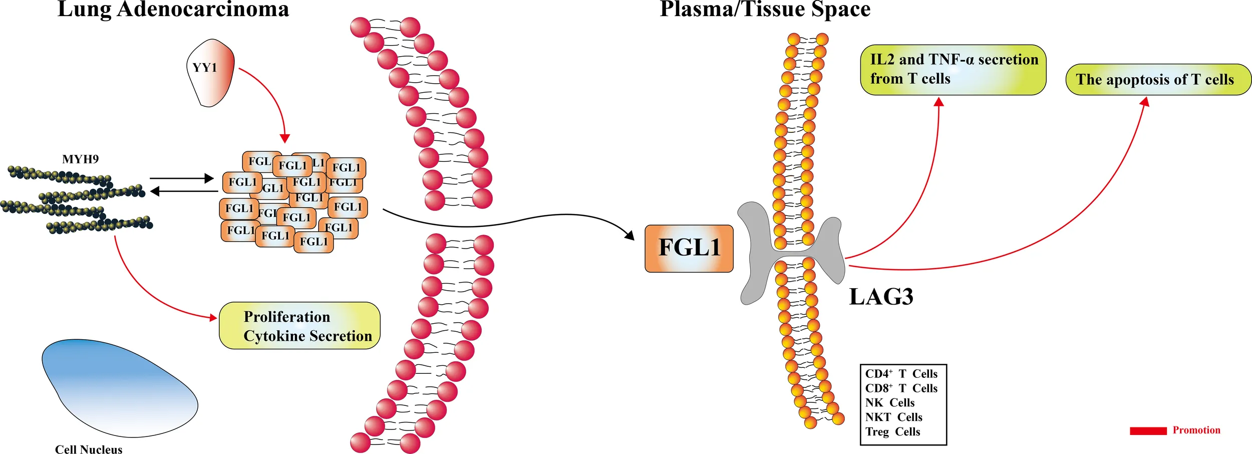 FGL1 may promote the secretion of IL-2, inducing the apoptosis of T cells. The YY1-FGL1-MYH9 axis is active in the FGL1-mediated regulation of proliferation, and is possibly involved in cytokine secretion.