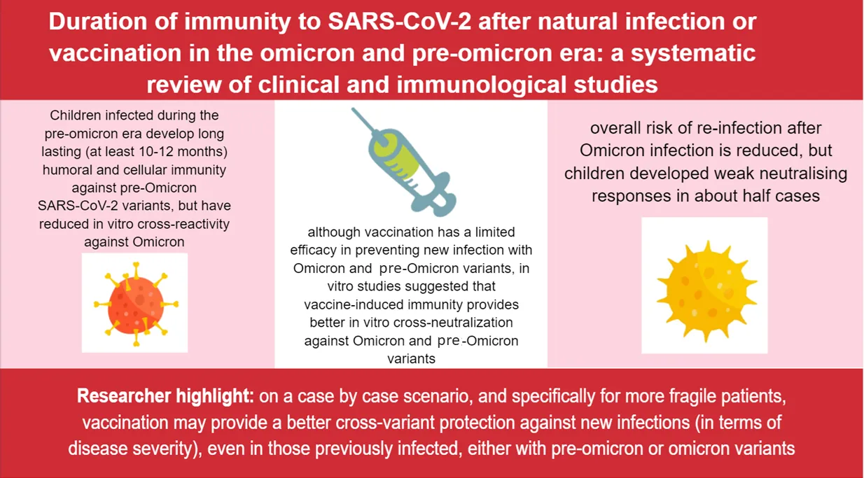Buonsenso D, Cusenza F, Passadore L, Bonanno F, De Guido C and Esposito S (2023) Duration of immunity to SARS-CoV-2 in children after natural infection or vaccination in the omicron and pre-omicron era: A systematic review of clinical and immunological studies. Front. Immunol. 13:1024924. doi: 10.3389/fimmu.2022.1024924