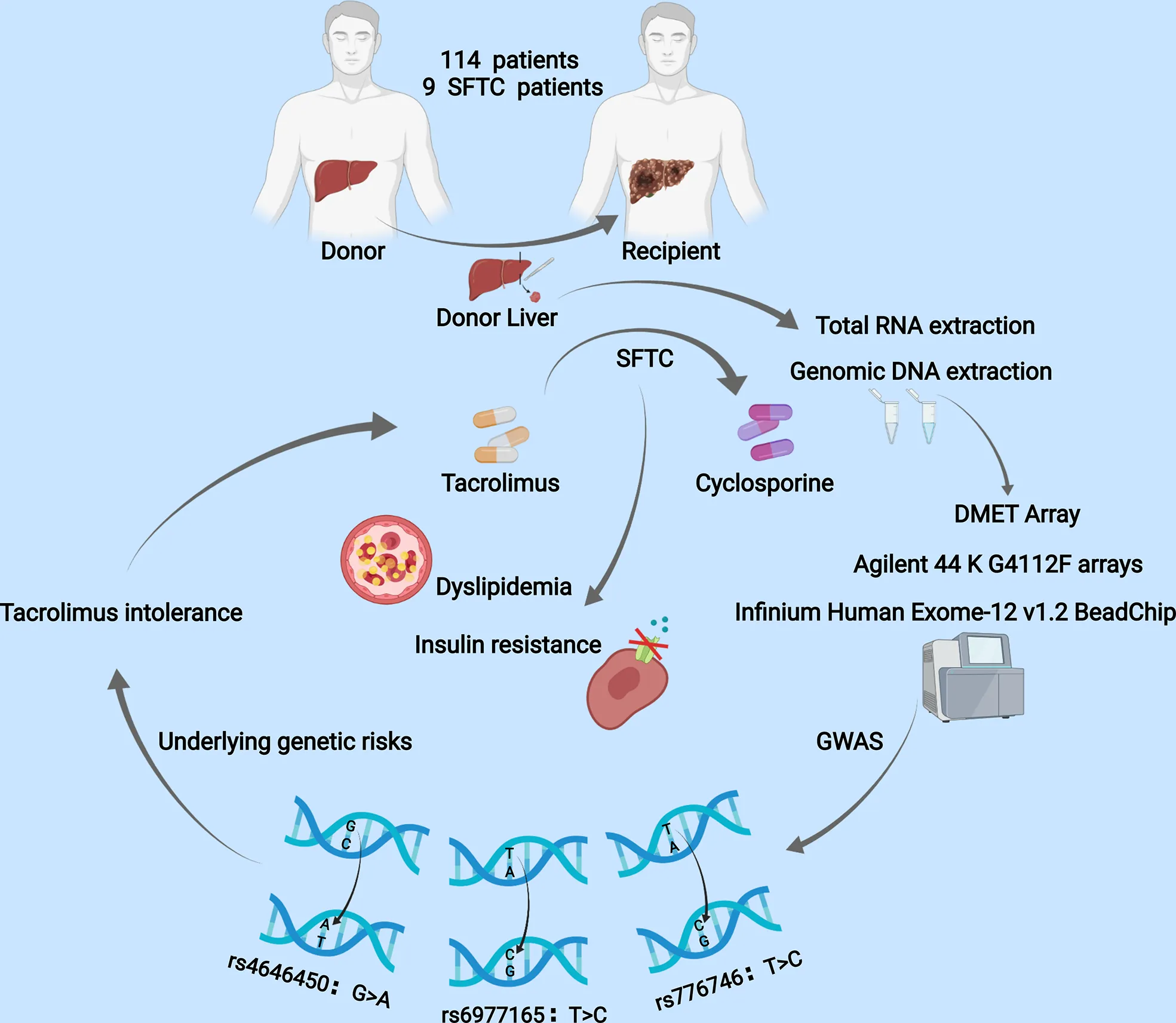 Interestingly, we note that some recipients of rapid tacrolimus metabolism must be switched to another immunosuppressive regiments for both economic and safety reasons. Hence, we wonder about the genetic factors behind switching from tacrolimus to cyclosporine (SFTC), as well as the influence of SFTC on prognosis. In this study, we integrate the multi-omics data of our transplant recipient with exome chip and transcriptome data to identify the reason for patients’ intolerance to tacrolimus and achieve individualized medicine.